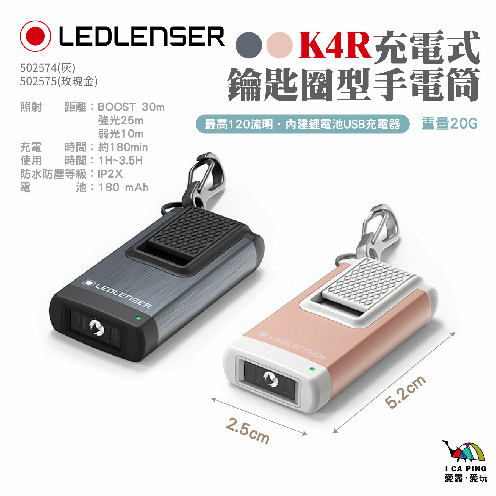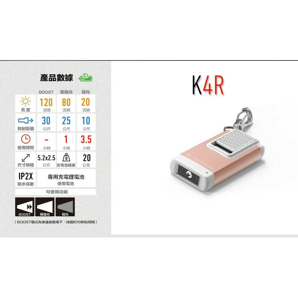 光通量:BOOST 120lm、強光80lm、弱光20lm